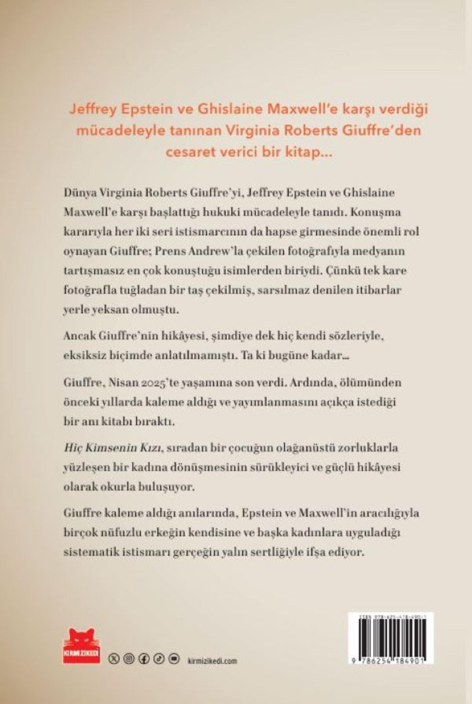 Giuffre kaleme aldığı anılarında, Epstein ve Maxwell’in aracılığıyla birçok nüfuzlu erkeğin kendisine ve başka kadınlara uyguladığı sistematik istismarı gerçeğin yalın sertliğiyle ifşa ediyor.